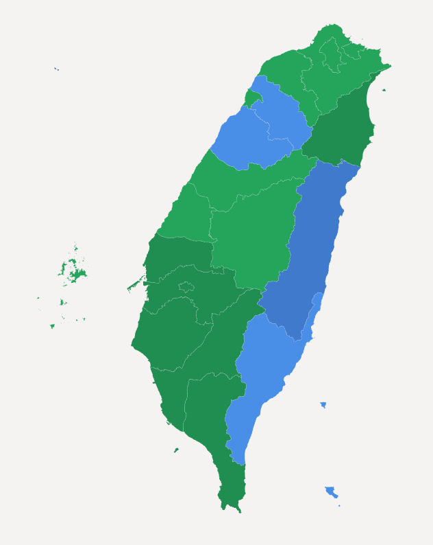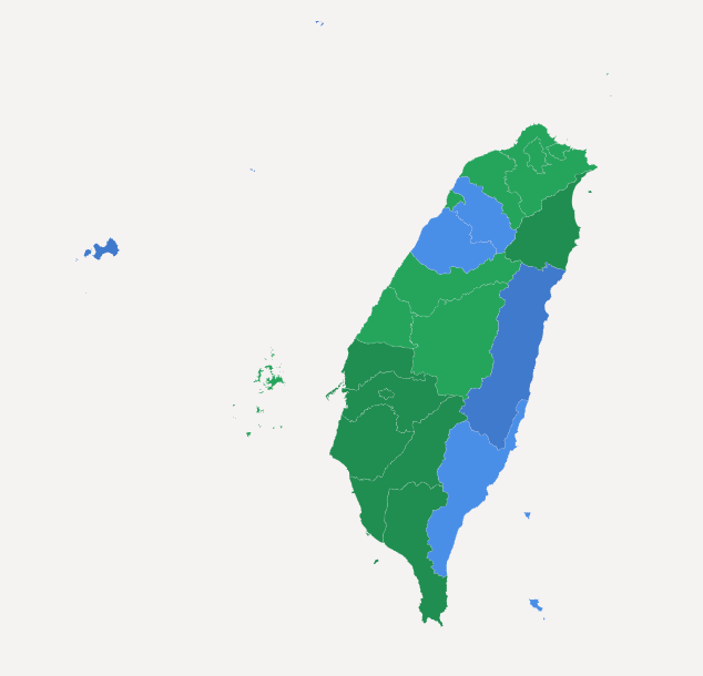 - 行政區會依照得票率顯示對應顏色的層級,得票率越高,區塊顏色越深