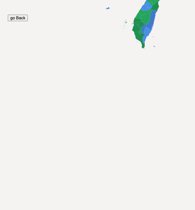 一開始以為是 zoom function 沒有寫好,但很詭異的是就高雄市有問題,後來發現罪魁禍首是那個離台灣有點遙遠的東沙群島,在畫面上小到幾乎看不到,因為 zoom 會把視角拉近到可以看到完整的縣市區域,就會連帶地把那些小島的顯示範圍也包含進來,因此就會出現一種很詭異的現象,明明我要從全台的視角切換到高雄市的視角反而變得超遠,其實這樣的顯示結果是正確的,只是不符合我們的預期,解決方式就是把那個小島直接刪掉,基隆的右上角也需要處理一下