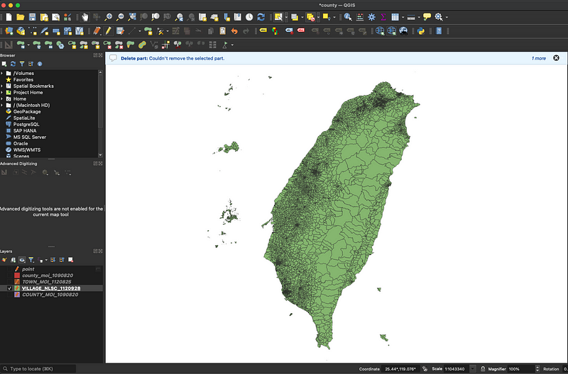 觀察一下天下雜誌和關鍵評論的地圖作法,都是把金門和馬祖挪到澎湖的正上方,這樣台灣本島既不會太小也能夠看到金門,真的是一石二鳥之計,本來還期待政府有沒有提供這種特規版本的圖資,但結果是沒有,想不到居然還是逃不過要編輯圖資這一步,爬文看到蠻多人用 QGIS 這個應用程式編輯的,只好乖乖下載 QGIS,開始學習怎麼使用 QGIS,花了一點時間看 youtube 教學,學習要怎麼搬移區域,怎麼刪除不要的區域,怎麼輸出等等(文章最後有影片教學連結,然後再把編輯完的結果 export 成 geojson,再丟到 mapshaper 轉成 TopoJSON,過程當然也是一波三折,轉換出來的圖資跟自己預期的不一樣就只能重做,做完縣市還有鄉鎮等著你,做完鄉鎮還有村里等著你… 果不其然在編輯的村里的時候瘋狂轉彩球,還好我的電腦有扛得住,超怕死當要再來一次