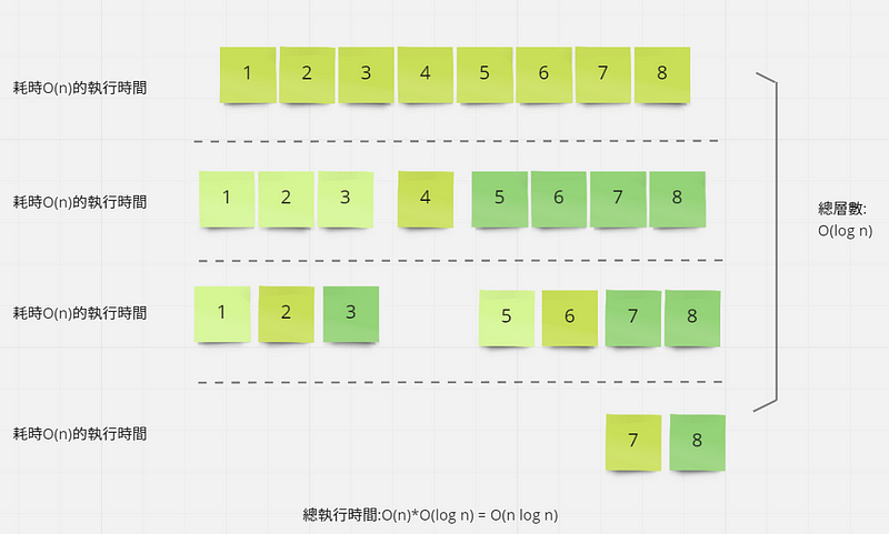 時間複雜度為 O(n)*O(log n) = O(n log n)
