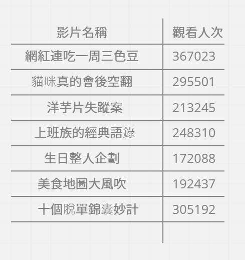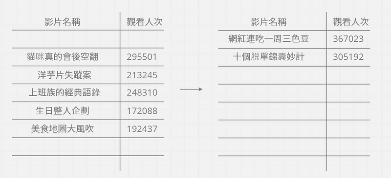 假如有一個影片清單希望能依照觀看人次多寡來做排序,先從原清單尋找最高觀看次數的影片 ,然後放入另一個空白清單,再回到原清單尋找最高人次的影片 ,放入空白清單,重複以上動作,直到原清單被清空為止。