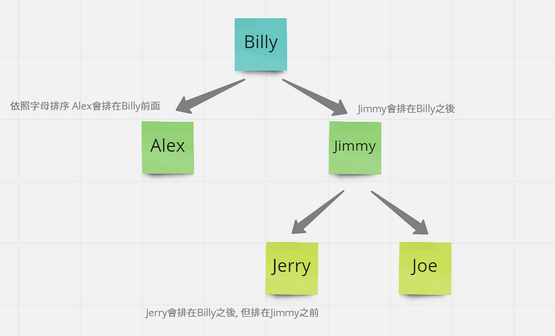 二元搜尋樹左邊的節點值比較小,左邊的節點值比較大。