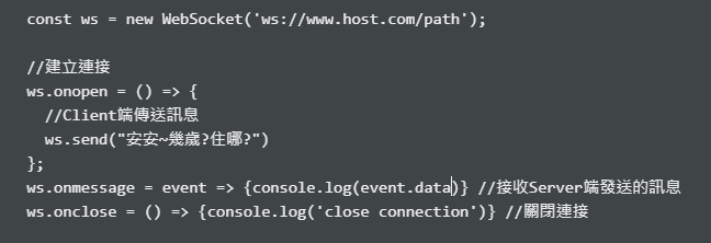 WebSocket 是一種讓瀏覽器與伺服器進行一段互動通訊的技術。這個 API 在不必輪詢(poll)伺服器下,讓使用者傳送訊息至伺服器並接受事件驅動回應。(引用自 MDN)