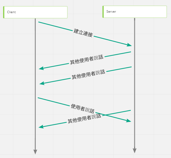 以往都是 Client 端主動跟 Server 端請求資料, 但 WebSocket 能夠建立雙向的溝通 ,建立連接後 Client 端和 Server 端可以互相傳遞資料,因此 Server 端有新資料的時候也能夠主動的通知 Client 端了,不再處於被動的角色,因此適合拿來作聊天室或是多人連線遊戲。