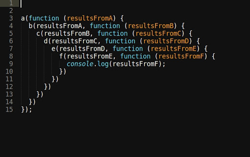 以往在處理非同步流程時,如果要確保執行順序並且帶入先前執行的結果會採用 callback 的方式,但很容易就會變成 callback hell 回調地獄(如下圖),不易閱讀之外也很難維護,而 Promise 的出現,可以優雅的解決這個問題