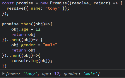 以下圖的例子來說,Promise.then 接收到 resolve 的結果,透過 then()逐一做加工(加上年齡、性別等等),最後可以得到一個完整的物件