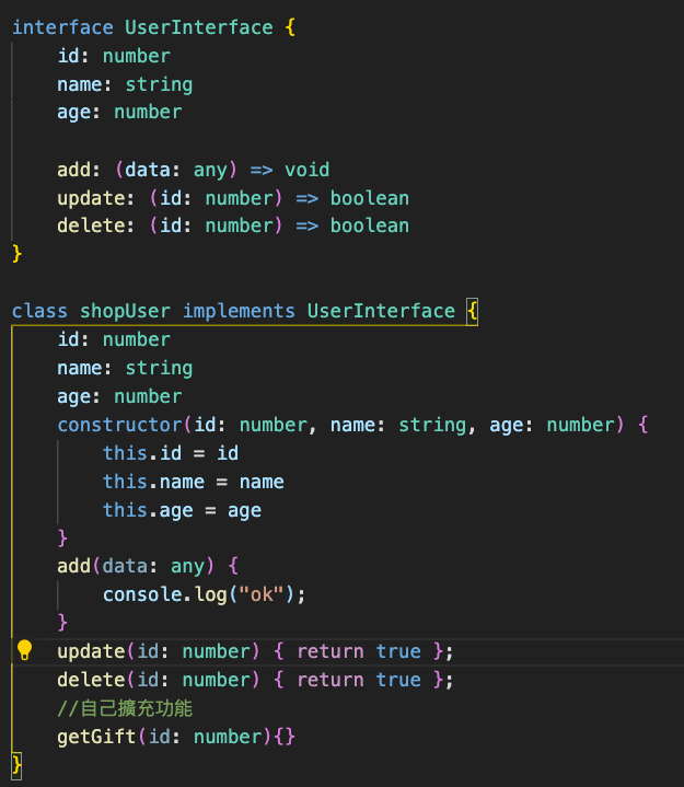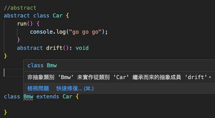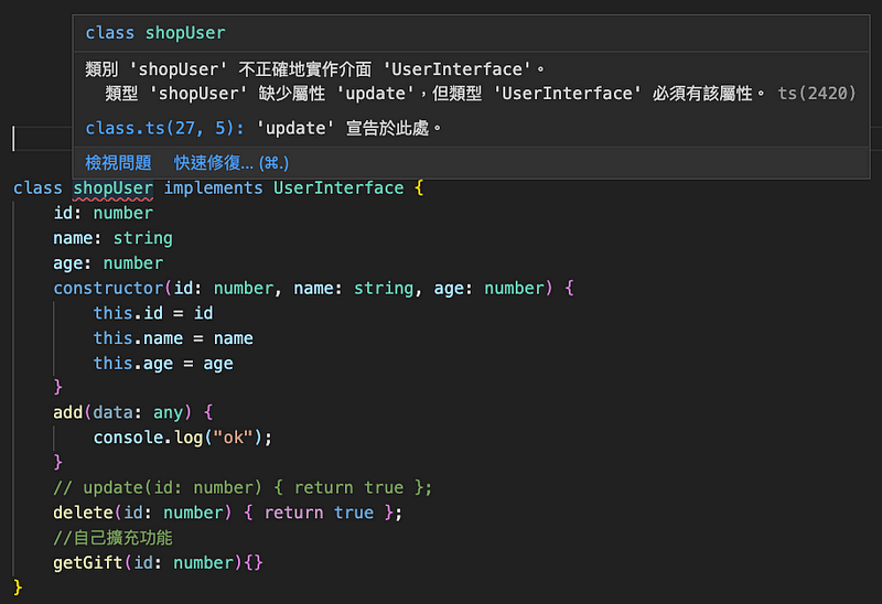 如果沒有依照 interface 實作所有的內容就會跳警告