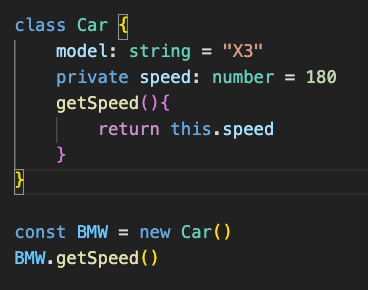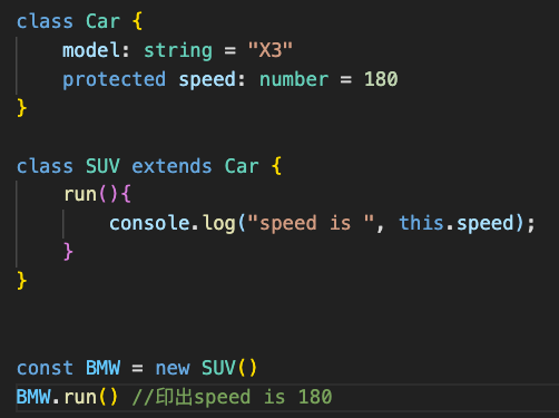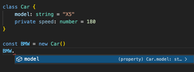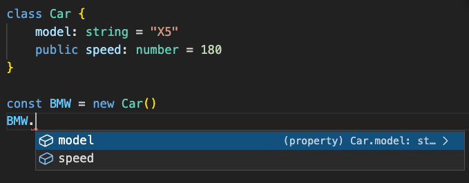 如果沒有在屬性前面加上修飾詞預設就會是 public,也可以手動標記修飾詞,public 允許外部存取,new 出來的實例可以取得 public 屬性