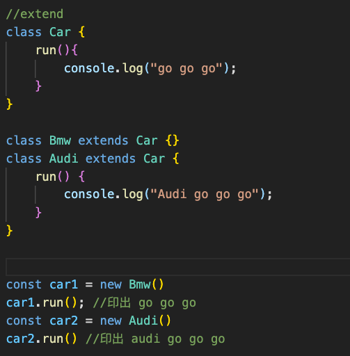 子類別用 extends 繼承父類別,讓子類別可以直接使用父類別的方法或屬性,如果子類別宣告與父類別相同的函式名稱,則會覆寫父類別的方法
