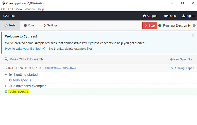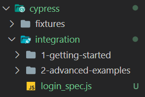 在 cypress/integration 底下新增login_spec.js,檔案的名稱可以依照自己要測試的功能命名,觀察範例的命名格式為xxx_spec.js