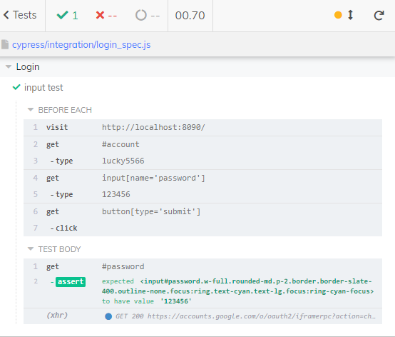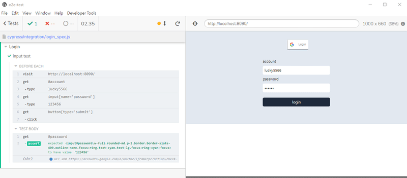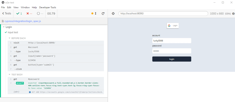 寫好之後回到 cypress 的視窗,點擊剛剛新增的 login_spec.js 就會自動執行