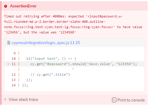 test case 要檢核內容很簡單,只是驗證密碼是否等於 123456 而已,如果刻意將輸入的密碼改成 1234568,cypress 就會顯示錯誤