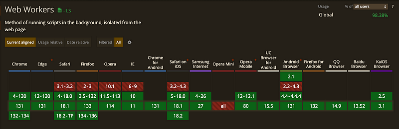 web worker 是 javaScript 原生提供的方法,不需額外安裝套件,也不侷限於任何一種前端框架使用,各家瀏覽器支援度非常的高!