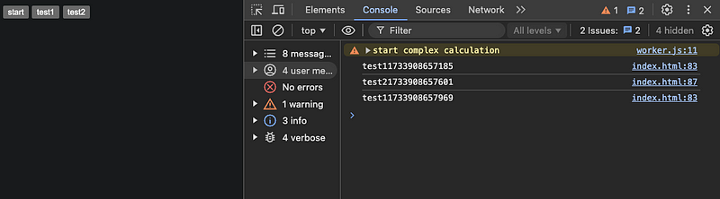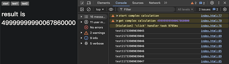 1 2 3 4 5 6 7 8 9 10 11 12 13 14 15 16 17 18 19 20 21 22 23 24 25 26 27 28 29 30 31 32 <body > <button id ="start" > start</button > <button id ="test1" > test1</button > <button id ="test2" > test2</button > <h1 > </h1 > </body > <script > const complexCalculation = ( ) => { let result = 0 ; for (let i = 0 ; i < 10000000000 ; i++) { result += i; } return result; }; document .getElementById ("start" ).addEventListener ("click" , () => { const res = complexCalculation (); document .getElementsByTagName ("h1" )[0 ].textContent = `result is ${res} ` ; }); </script > <script > document .getElementById ("test1" ).addEventListener ("click" , () => { console .log ("test1" + Date .now ()); }); document .getElementById ("test2" ).addEventListener ("click" , () => { console .log ("test2" + Date .now ()); }); </script >