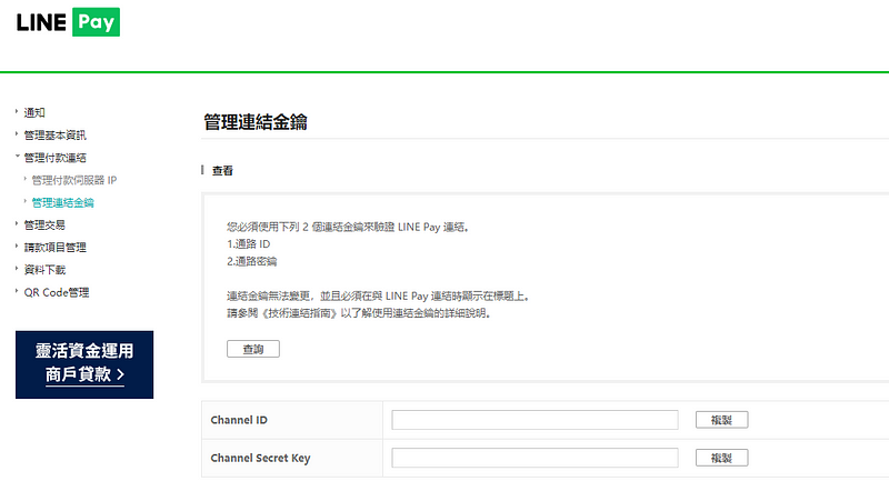 申請好帳號之後登入管理平台,點開選單內的管理連結金鑰的頁面,按下查詢,會寄送驗證碼到你的電子信箱,驗證成功即可取得金鑰