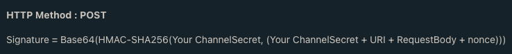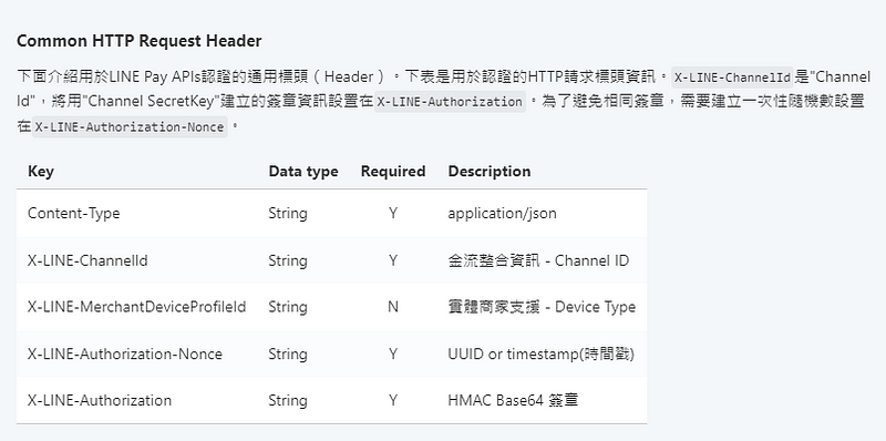準備好了 request body 之後,接下來就是準備 request header 了,這裡會需要用加密的方式製做簽章(使用 crypto-js 套件),將 LinePay 規定的資料組合在一起,加密這邊有個小陷阱,看 LinePay 官方的文件是這樣寫的