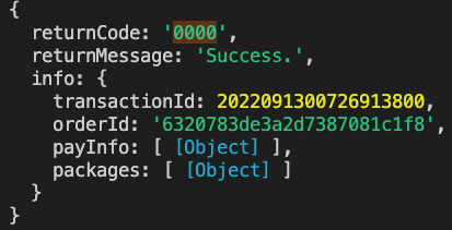 所有需要的資料都準備好了就可以打 API 了! 如果傳送的資料格式都正確的話,api 的 response 的 returnCode 就會回應 0000,而 info.paymentUrl.web 就是我們要取得的跳轉網址
