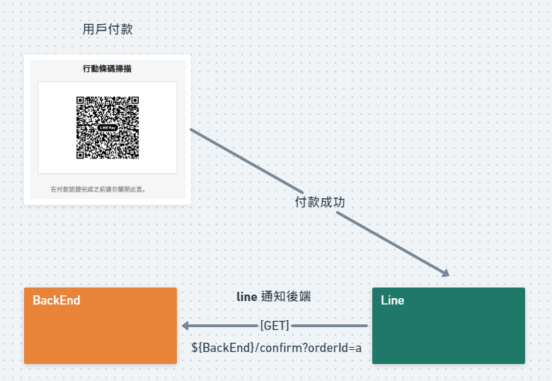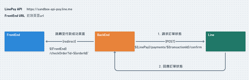 不過為了安全性,我們必須再次詢問 LinePay 這筆訂單是否真的付款成功了,這裡的流程可以劃分成三個步驟: