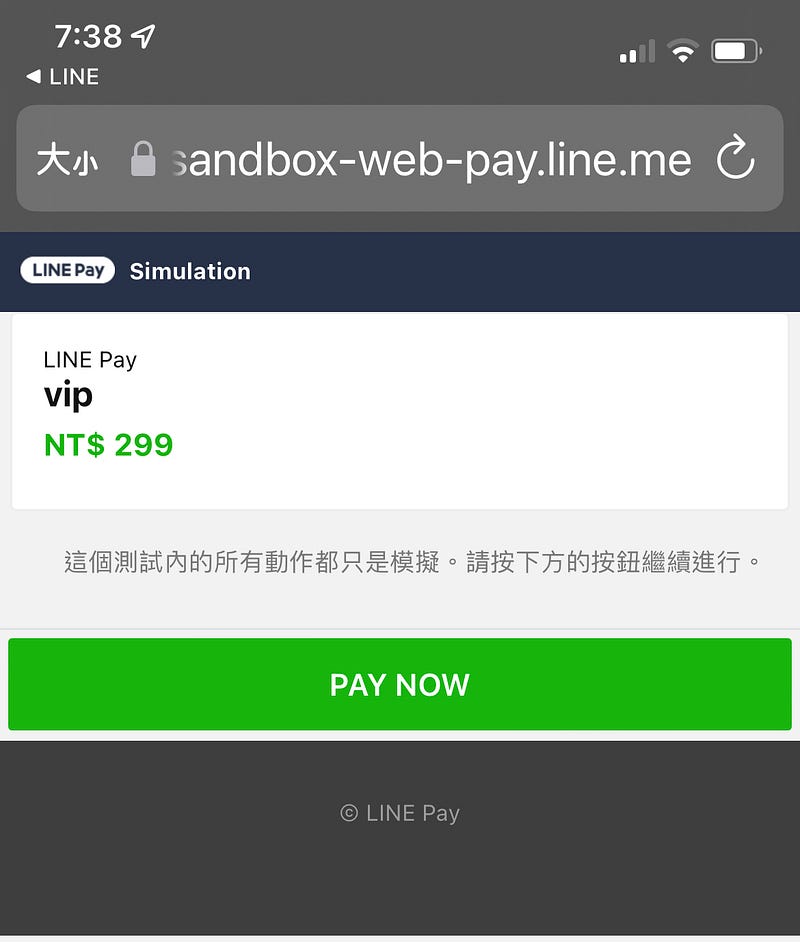 當使用者用 app 掃描畫面上的 qrcode,就會看到以下畫面,不會真的扣款,可以放心按下去