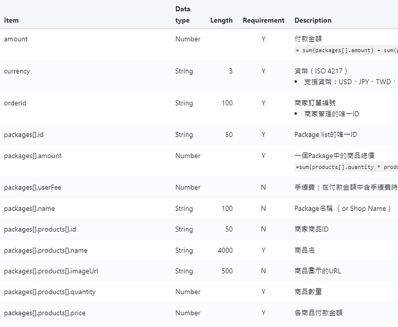 LinePay 要求的訂單資訊如下 request body