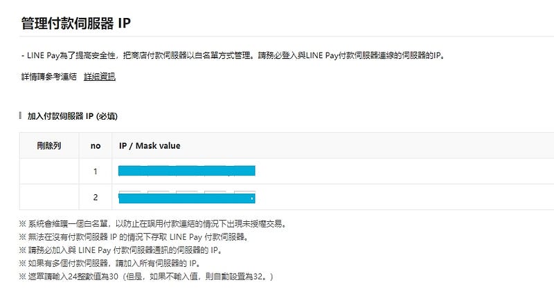為了提高安全性,必須將我們的後端 server IP 設為白名單,防範來路不明的請求,不過測試環境貌似可以不用設定,API 也能打得過