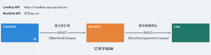 點選購買的按鈕之後,前端會用 POST 的方式呼叫後端 /linepay 這支 API,後端收到請求後會先在資料庫建立一筆訂單,再呼叫 LinePay 的 API 請求付款網址