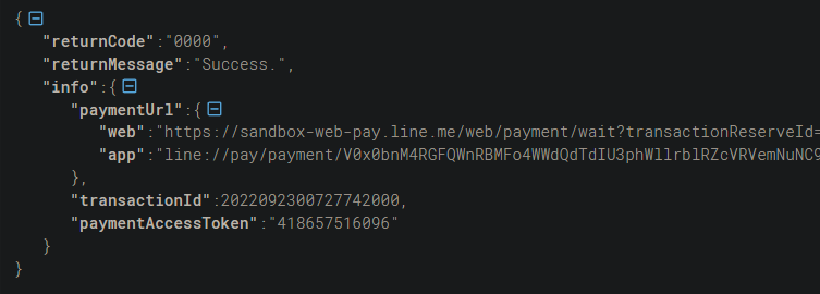 - 如果訂單成功,LinePay API 的回應結果如下