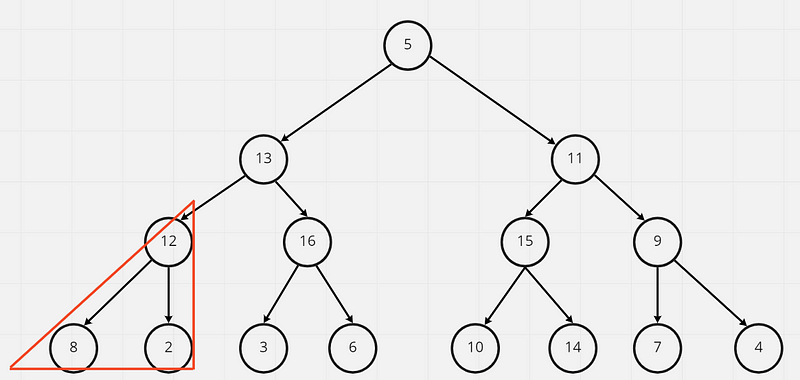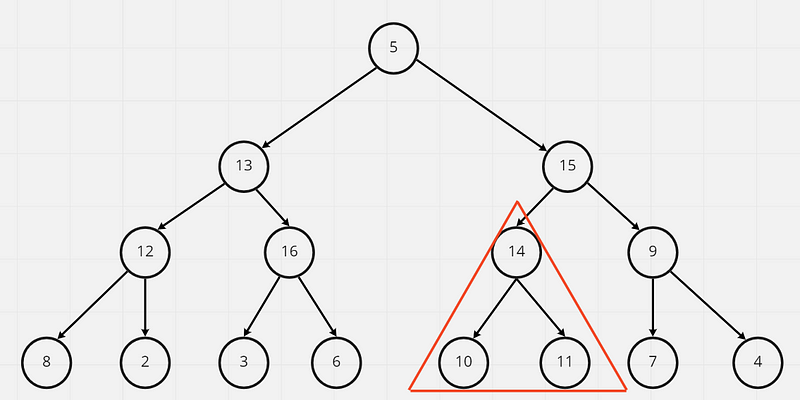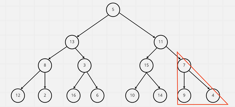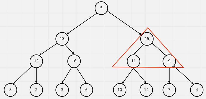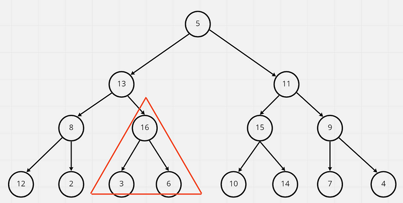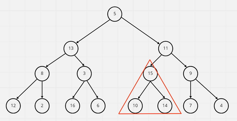 首先先將 tree 轉換成陣列,由上到下將每個節點取出的話 ,可以得到一個陣列[5, 13, 11, 8, 3, 15, 7, 12, 2, 16, 6, 10, 14, 9, 4]