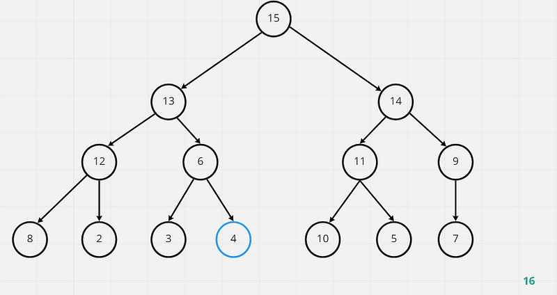 - 先將根節點(16)與 leaf node 最右邊的節點(4)做交換,此時 4 會在根節點的位置,16 會跑到右下角,接著移除右下角的節點並取出 16 放在下方,這時會發現 4 並不是這整顆樹裏面的最大值,因此 4 要向下交換