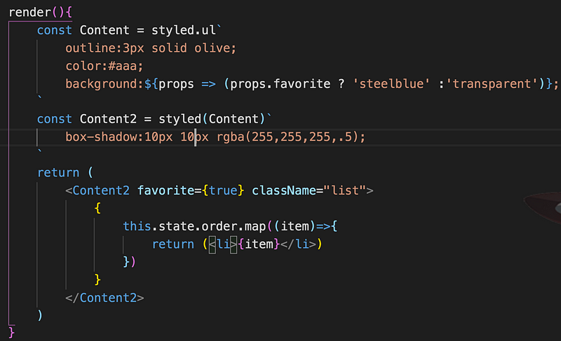 這邊還提供了一個類似 scss extend 的功能,可以繼承現有 styled,再撰寫自己獨有的樣式,將 Content 的樣式傳入 Content2 的 styled(),如此一來 Content2 也會有 Content 的樣式