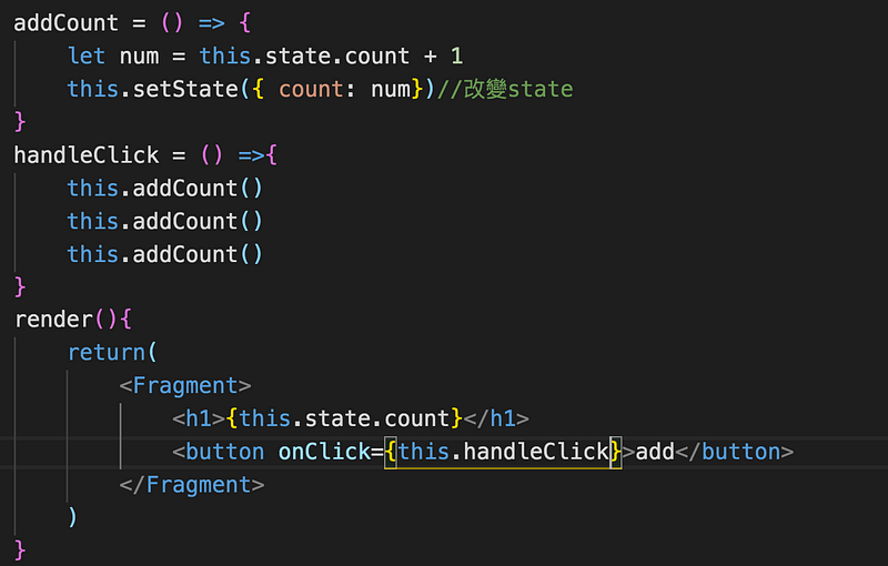如果是 create react app 的話不需要寫 constructor 了,因為已經引用了@babel/plugin-proposal-class-properties套件,可以直接寫 state,但因為練習的關係,接下來的範例還是會乖乖寫 constructor