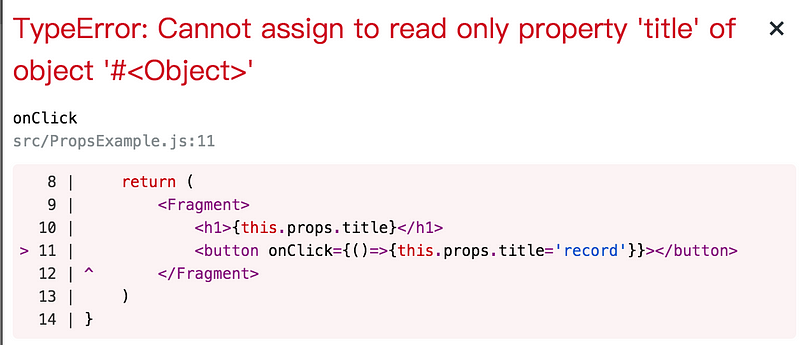 就會報錯了!告訴你這是個唯獨的值,因此想要改動的話,還是乖乖從父組件異動吧!或者將 setState 的方法透過 props 丟給子組件,讓子組件呼叫也是可以達成修改 props 的目的