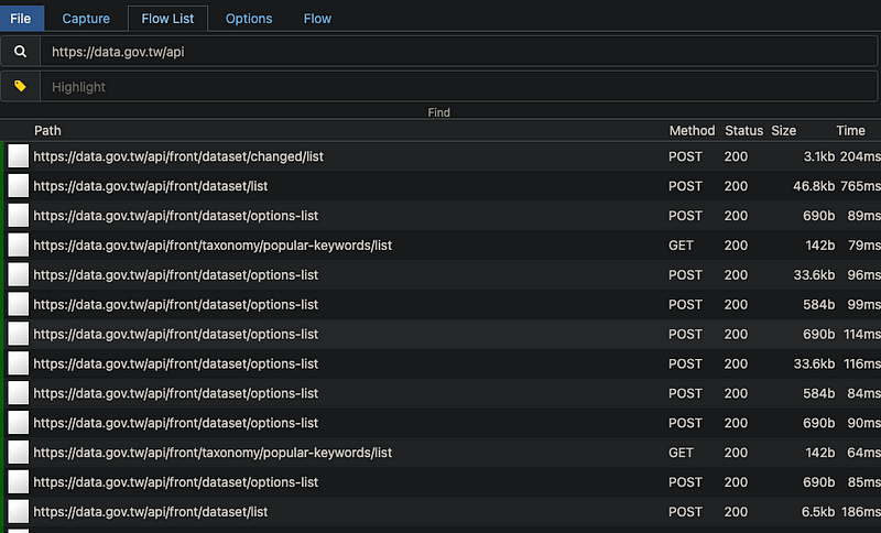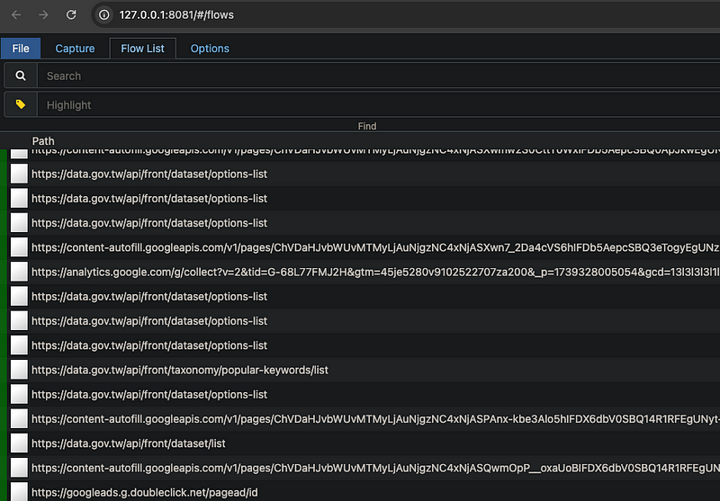以政府的公開 api 平台為例https://data.gov.tw/,進到網頁後任意地點選幾個頁面再回到 127.0.0.1:8081 查看,會發現剛剛所有瀏覽的紀錄都會被記錄起來