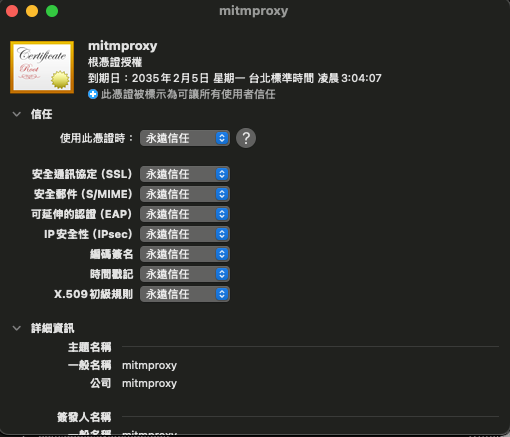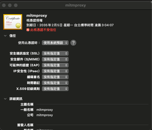 下載 mitmproxy 的憑證之後,點兩下就會自動安裝,憑證預設為不受信任