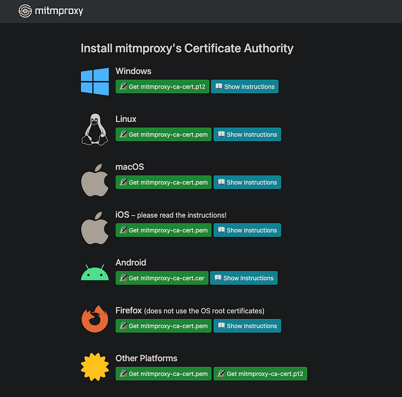在網址列輸入 mitm.it 會看到以下畫面,再根據不同的平台下載對應的憑證