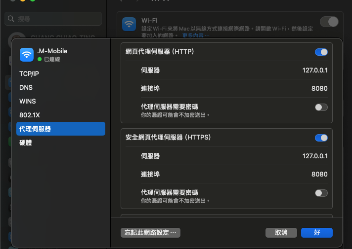 在 MAC 系統設定裡開啟代理伺服器的設定,打開 http 和 https 的 proxy,並且將伺服器和連接埠設定為 mitmproxy 預設的 127.0.0.1 和 8080