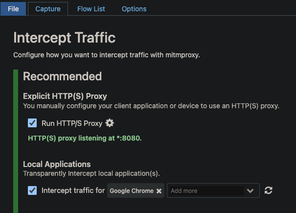 在 capture 的頁籤裡建議可以設定 local applications,因為 proxy 會攔截的網路封包不僅僅只是網頁的而已,還包含電腦上其他應用程式,ex. line、outlook、discord,任何在電腦上會連上網的應用程式的網路封包都會被追蹤,因此在查看 log 會有雜訊過多的問題,因此建議設定為要監看的目標即可 ,作者的目的是要監看網頁的封包,因此設定為 google chrome