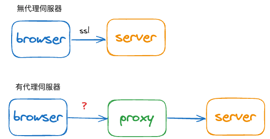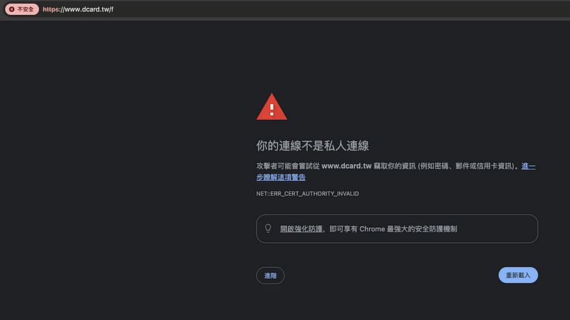 以往在沒有代理伺服器的情況下,瀏覽器會和 web server 建立 SSL/TLS 安全連線(https),但現在因為我們開啟了代理伺服器,瀏覽器和 server 之間多了一個中介者,瀏覽器認為代理伺服器沒有安全憑證所以認定為不安全連線,所以我們需要在自己的電腦上安裝 proxy 的憑證