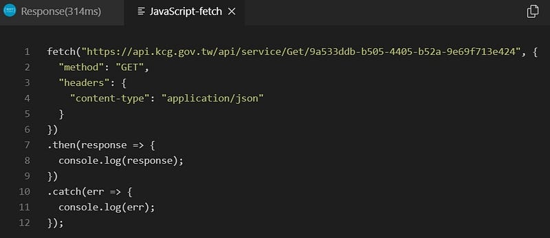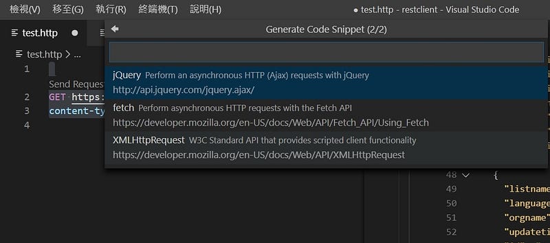 會詢問你要生成哪一種 code snippet,任君挑選!隨便點了一個 fetch 看看