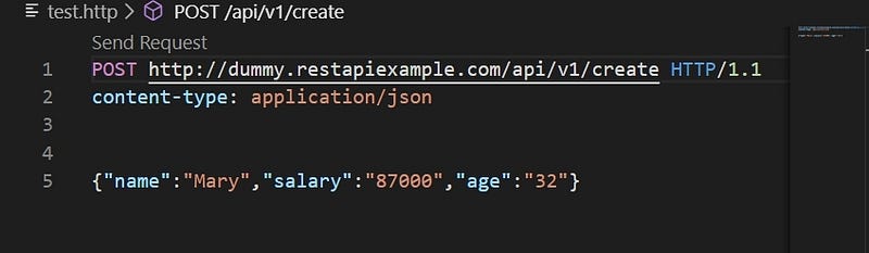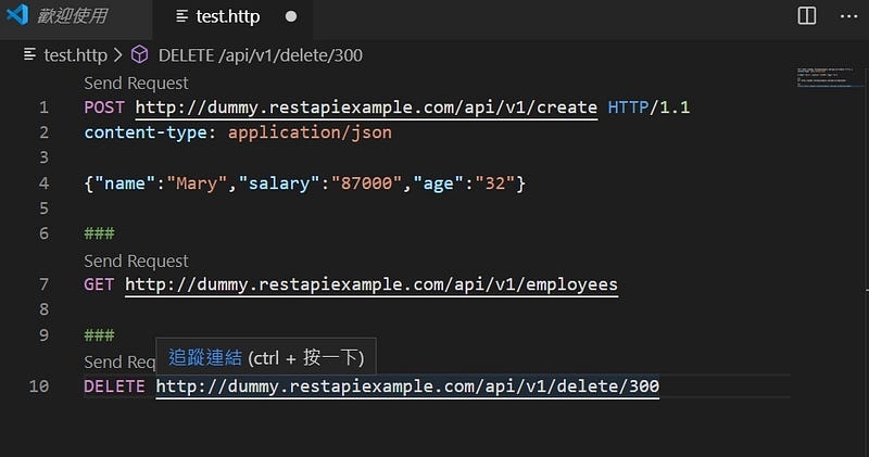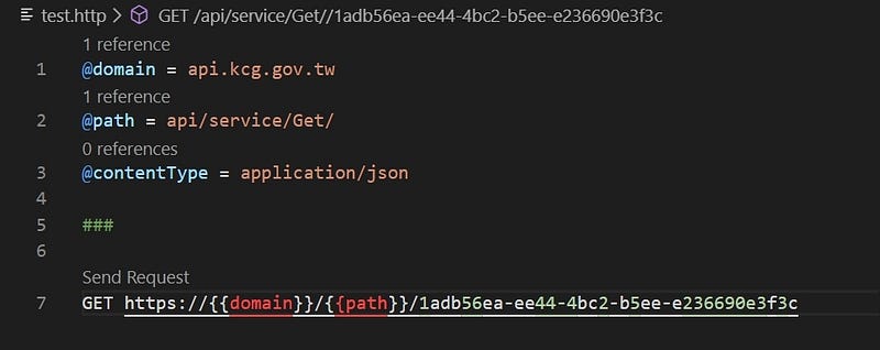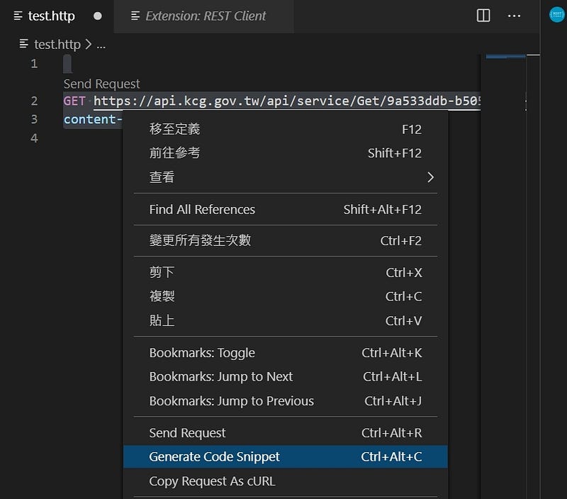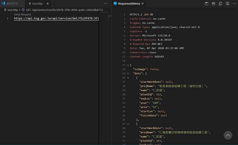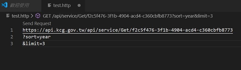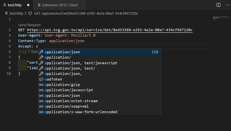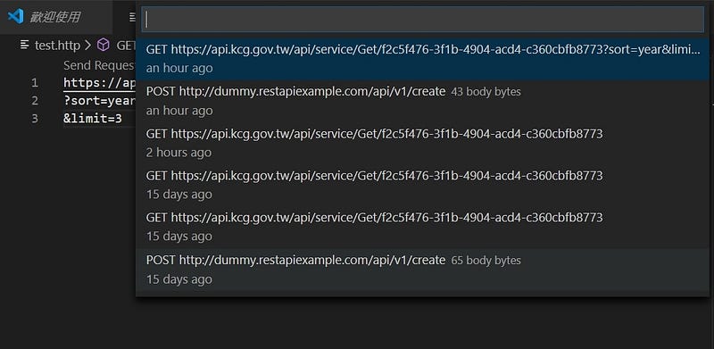 安裝完 REST Client 後先新增一個副檔名為.http 或是.rest 的檔案,然後貼上 api 網址,按下 send request。
