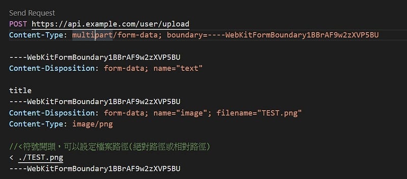上方是傳送圖片的範例格式,可以利用<來設置傳送檔案的路徑