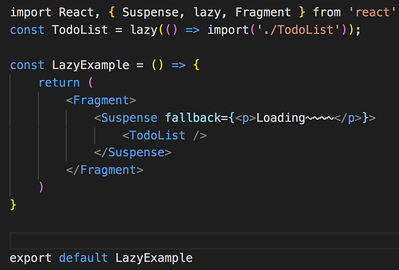 1 | const TodoList = lazy(() => import(/\* webpackChunkName: "toDoList" \*/'./TodoList')); |