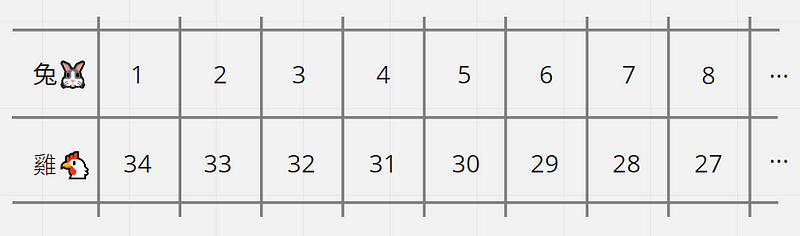 這是中國古代經典的數學題目,也可以用列舉法來推算答案,假設有數隻雞和兔子被關在同一個籠子裡,從上面數有 35 顆頭,從下面數有 94 隻腳,試問籠子裡有幾隻兔子和幾隻雞?