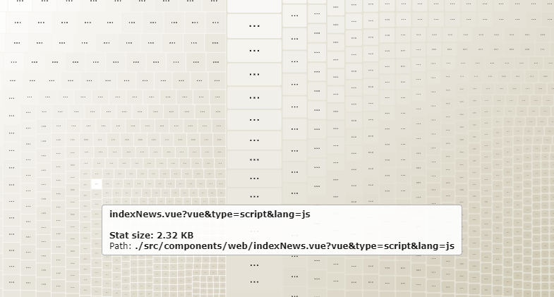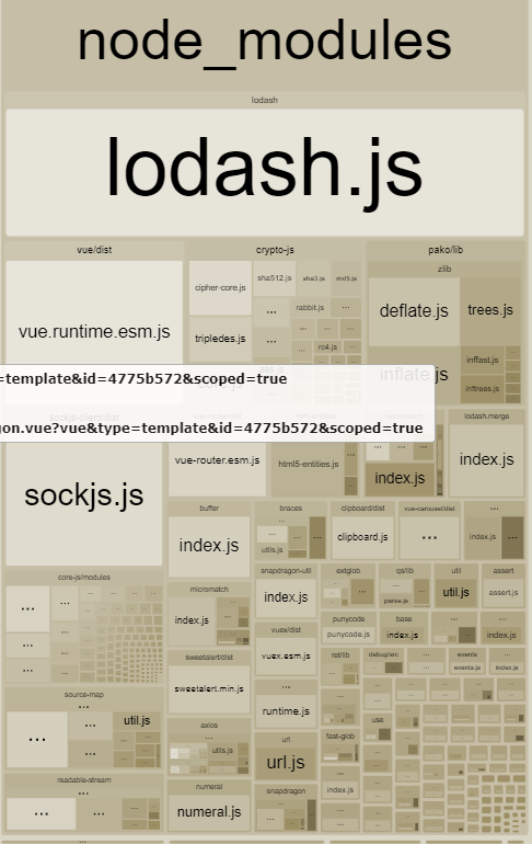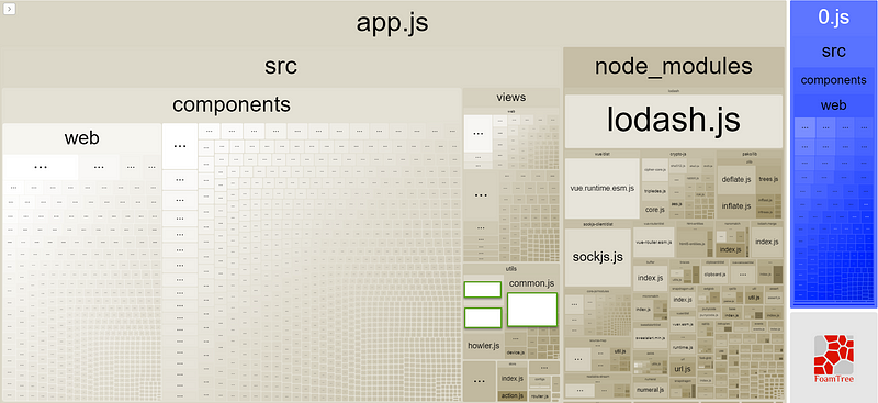 因為專案的 component 和套件數量龐大,所以就會看到密密麻麻的小方格, 排在越上方的代表檔案越大,這才發現 loadsh 真的是….超級肥!