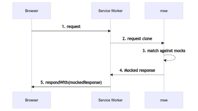 Mock Service Worker 在瀏覽器環境的實作原理是使用 service worker 這個 WEB API 來攔截 http request,再將 API response 的內容替換成我們模擬的資料,流程可參考下圖