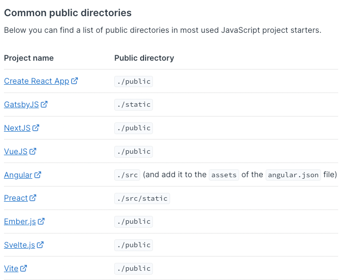 可是… 我的專案底下沒有 public 資料夾啊,沒關係官網列出了常見的專案 public 路徑,是不是很貼心?