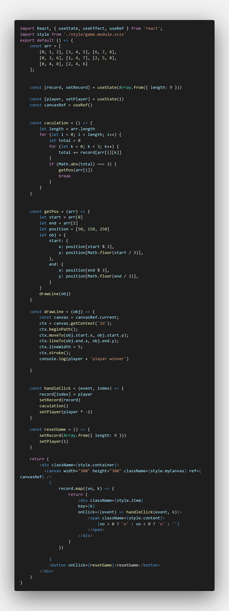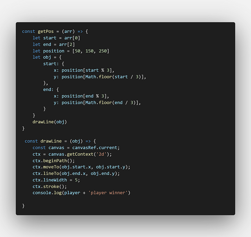 用 canvas 來畫線,在一開始就已經建立好畫布,只是先隱藏起來,這邊用偷懶的方式, 設定一個 x、y 的陣列,大概抓個格子的中線位置,所以畫的線不會很精準,先取出獲勝的組合假設是 1、4、7 好了,抓陣列第一個數字為起點,陣列最後一個數字為終點,再利用除法和取餘數,拿到這兩個格子是位在第幾列的第幾行