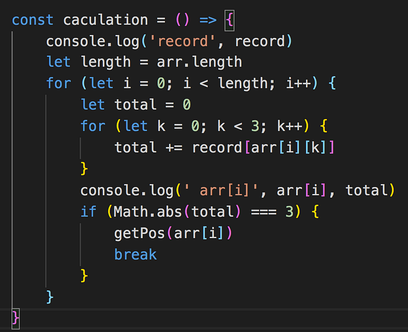 每當玩家點擊格子, 該格子就會依照是哪位玩家 ,就放入對應的數字 1 or -1 ,並且馬上比對剛剛列出八種勝出方式的陣列,並將格子內的 ox 轉換成對應的數字加總並且取絕對值 ,如果為 3 就是有人勝出了, 中斷迴圈開始準備畫線