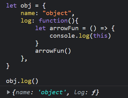 必須說箭頭函式的出現,讓 this 又變得更撲朔迷離 😂,因為它沒有自己的 this,跟上述大部分的例子都不相同,它的 this 是被宣告當下所在環境的 this,箭頭函式在 log 裡面宣告,而 log 的 this 指向 obj,因此箭頭函式的 this 指向 obj