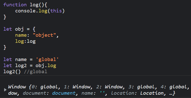 接著介紹另一種情況,先宣告一個變數 log2,並且把 obj 的 log 方法指定給 log2,執行 log2 函式, 會發現印出來的 name 會是 global,為甚麼 this 指向變成 window 了? 因為執行 log2 函式就等同是執行 window.log2,因此 this 指向 window